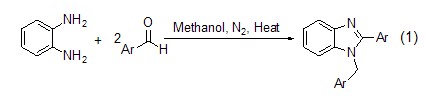 鄰苯二胺和兩當(dāng)量的芳香醛在甲醇中反應(yīng)時(shí),生成相應(yīng)的五元氮雜環(huán)的苯并咪唑衍生物 (式1)[3]。